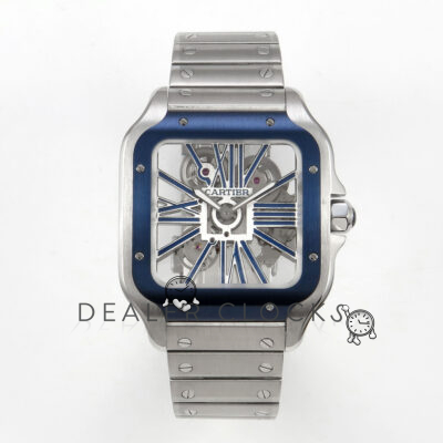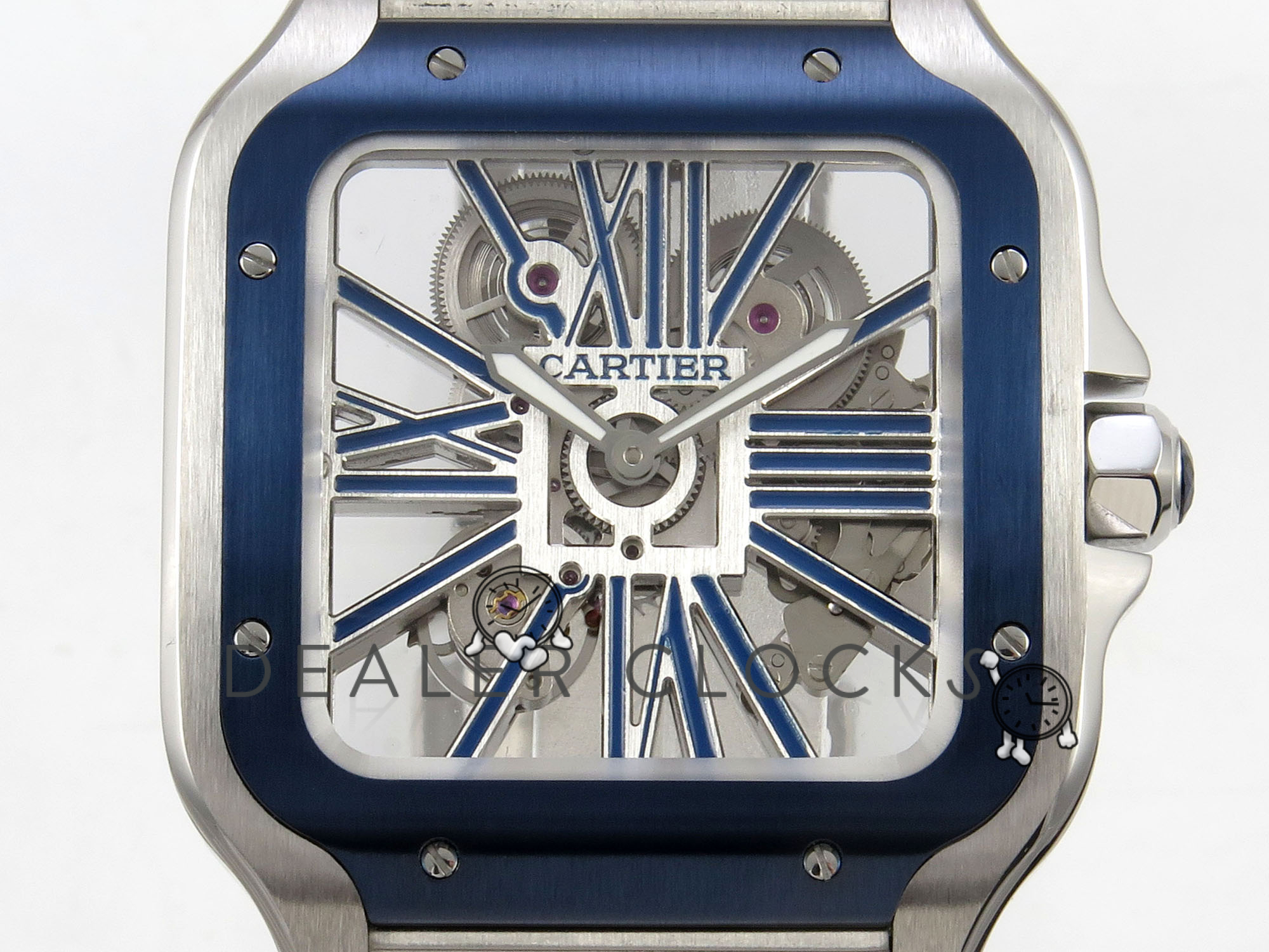 Santos de Cartier Skeleton SS MLF Skeleton Blue Skeleton Dial Blue Bezel on SS SmartLink Bracelet 9611MC Super Clone