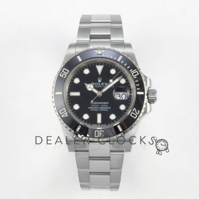 Dial: SuperLumed Black textured dial with uni-directional rotating rehaut (set via screwed-in crown at 10 o’clock) and DOUBLE AR coated date cyclops updated to near colorless